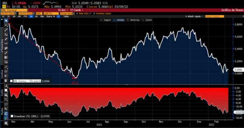 El real de Brasil también se apreció considerablemente y le permite al peso ganar competitividad. Desde su pico reciente, el real se apreció 13% contra el dólar y opera cerca de sus mínimos del año, habiendo pasado de R$ 5,78 a R$ 5,05 actualmente.