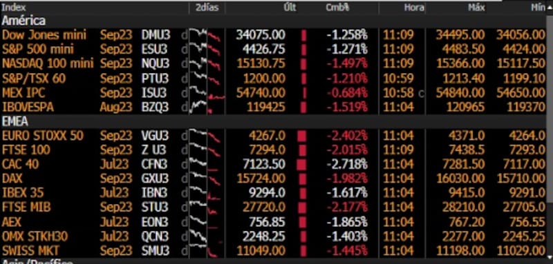 Por su parte, el DAC30 de Alemania, el FTSEMIB de Milán y el Ibex35 de España también caen, perdiendo entre 1,8% y 2%.