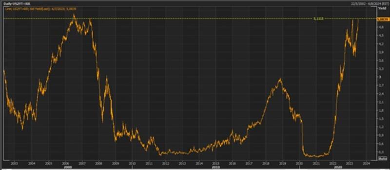 Ante la expectativa de ver mayores subas de tasas, la curva americana se desplaza hacia arriba y el rendimiento del bono del Tesoro norteamericano a 2 años supera el 5,05%, siendo este el mayor valor desde 2007.