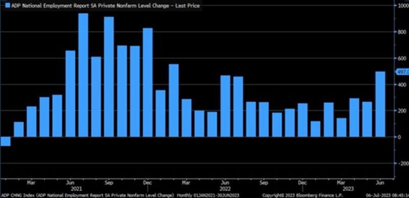 Tras la publicación del informe ADP mejor de lo esperado, las expectativas de ver una suba de tasas en julio en 25 puntos básicos saltaron al 95%, desde el 88% previo a la publicación del dato.