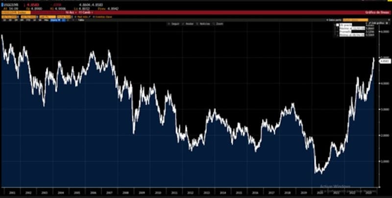 Hoy las tasas de los bonos del tesoro se ubican en su nivel más alto en 16 años, contribuyendo a que las condiciones financieras se tornen más estrictas.