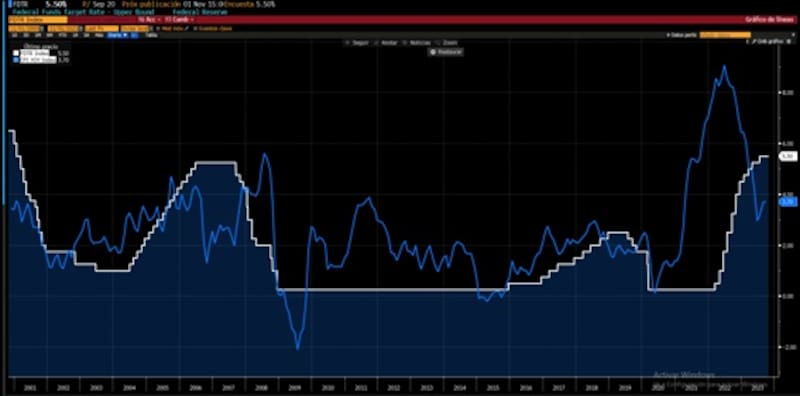 La suba de tasas de los bonos del tesoro americano contribuyó para que la Fed no eleve aún más la tasa de interés. En septiembre la Fed dijo que podría haber una suba adicional. Por ello, la atención ahora pasa a lo que pueda ocurrir en la última reunión, en diciembre.