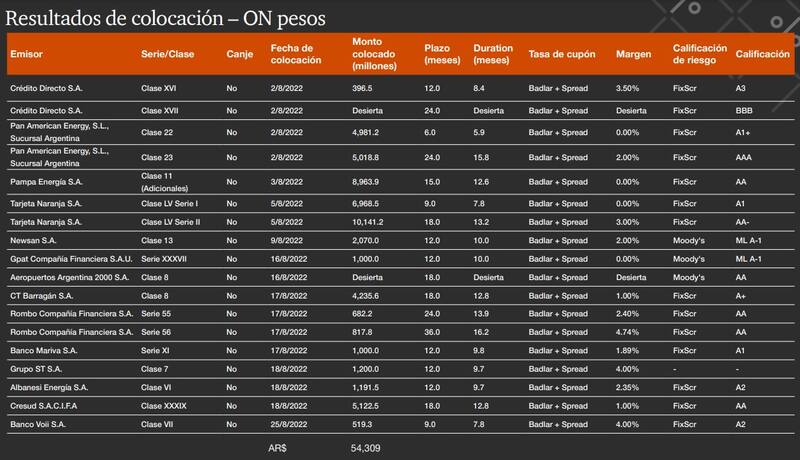 En el régimen general de Obligaciones Negociables en moneda local se destacaron cuatro empresas, que emitieron un monto superior a la sumatoria de todas las colocaciones realizadas en junio y julio. Se trata de Naranja X, Pan American Energy, Pampa Energía y Cresud, que en total colocaron casi $ 41.200 millones.