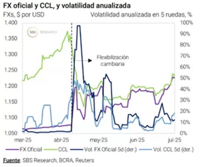 En línea con ese rebote, la volatilidad cambiaria promedio de 5 días del topo de cambio oficial y del contado con liquidación pasó de del 5% a niveles de entre 10% y 20%.
