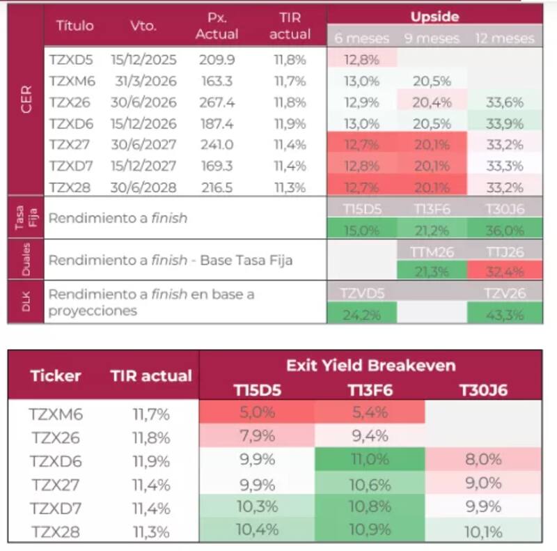 "Con base en nuestras proyecciones, que contemplan un sendero de inflación a la baja hacia los próximos meses, la TIR de los CER debería comprimir 674 pb en un plazo de seis meses, 632 pb en un plazo de nueve meses y 390 pb en doce meses para igualar el rendimiento de un instrumento a tasa fija a plazos comparables. Las exigencias en cuanto a la compresión de spreads favorecen tanto los títulos a tasa fija como a los duales", indicaron.