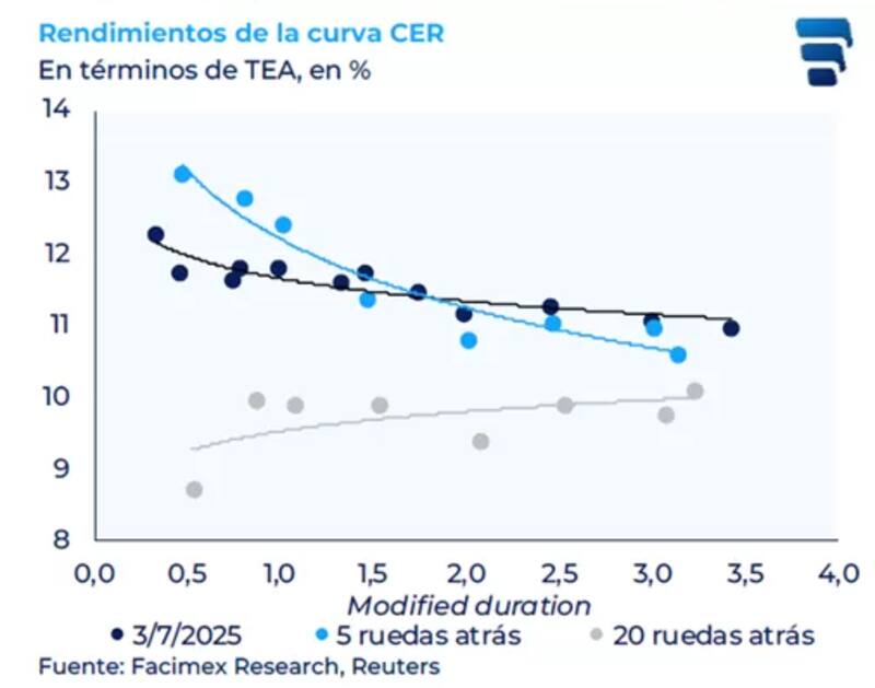 "Esto se tradujo en una marcada descompresión a lo largo de la curva CER, cuyos rendimientos pasaron de CER +10% a comienzos de junio a niveles cercanos a CER +11,5% en la actualidad", detallaron.