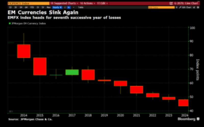 El índice de monedas de mercados emergentes de JPMorgan Chase & Co. se encamina a un séptimo año consecutivo de pérdidas. En 2024, todas las principales monedas de mercados emergentes han perdido valor frente al dólar, salvo el rand sudafricano y el ringgit malayo. Al menos nueve de ellas han registrado caídas del 10% o más.