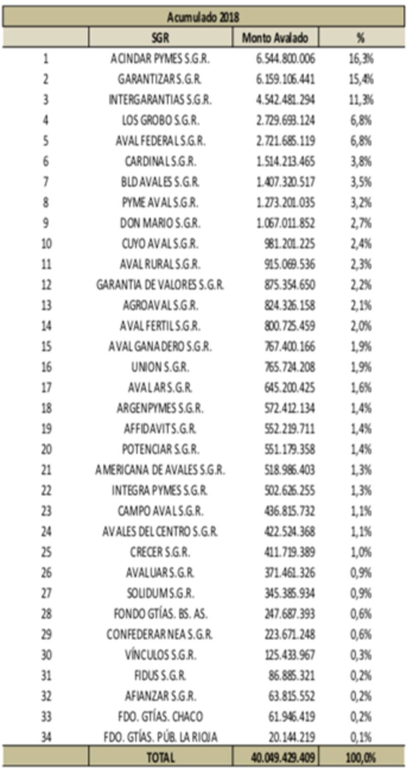 La comparación con el año 2017, refleja un crecimiento del 106%, reflejando un destacado crecimiento real de los avales otorgados y consecuentemente un mayor financiamiento a pymes a través del mercado de capitales. Si bien la cantidad de SGR supera a las 30, del total avalado en 2018, el 50% se concentra en cuatro de ellas.