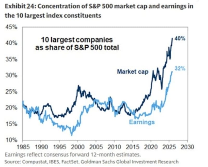 Los analistas de Baires Asset Management señalaron que la alta concentración del S&P 500 en solo 10 compañías (principalmente Big Tech) es un fenómeno que vienen monitoreando ya que altera la relación riesgo-retorno tradicional de los índices pasivos.