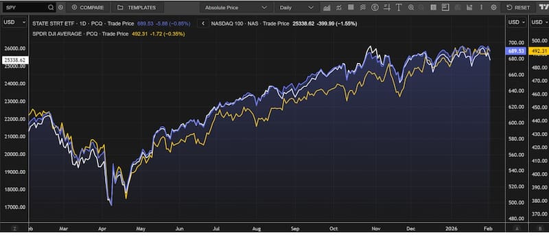 El Dow Hones sube 2,4% en 2026, mientras que el S&P500 sube 1,1%.
