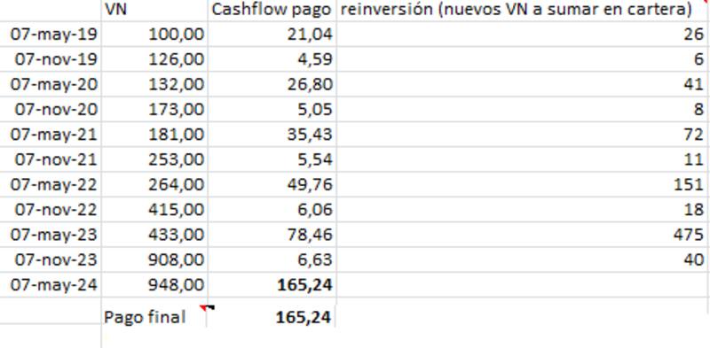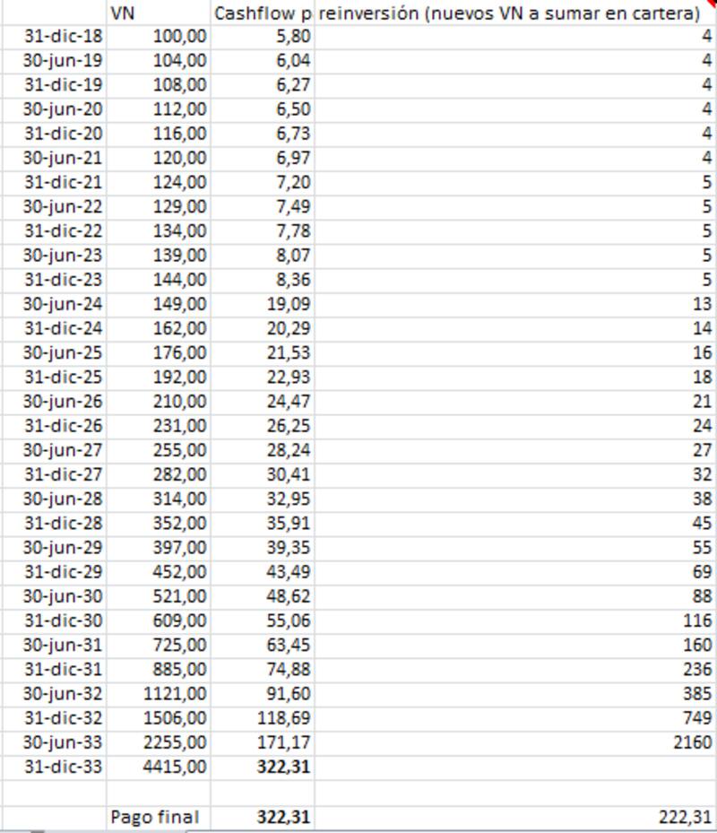 Para poder incrementar el capital inicial de esa manea se plantean varios supuestos. El primero y quizá el más fuerte es que la Argentina no va a entrar en default y va a pagar sus compromisos. Por otro lado, se plantea el supuesto de que el inversor reinvierte los intereses y las amortizaciones de capital en cada vencimiento. Y el último supuesto, es que el inversor se compra el bono y se lo queda hasta el final, es decir, no realiza estrategias de compra venta de corto plazo. Siempre asumiendo que en cada fecha del flujo de fondo del bono se compra a la misma paridad (precio) que el de la actualidad (08/11/18) y se reinvierte los fondos a la misma TIR.