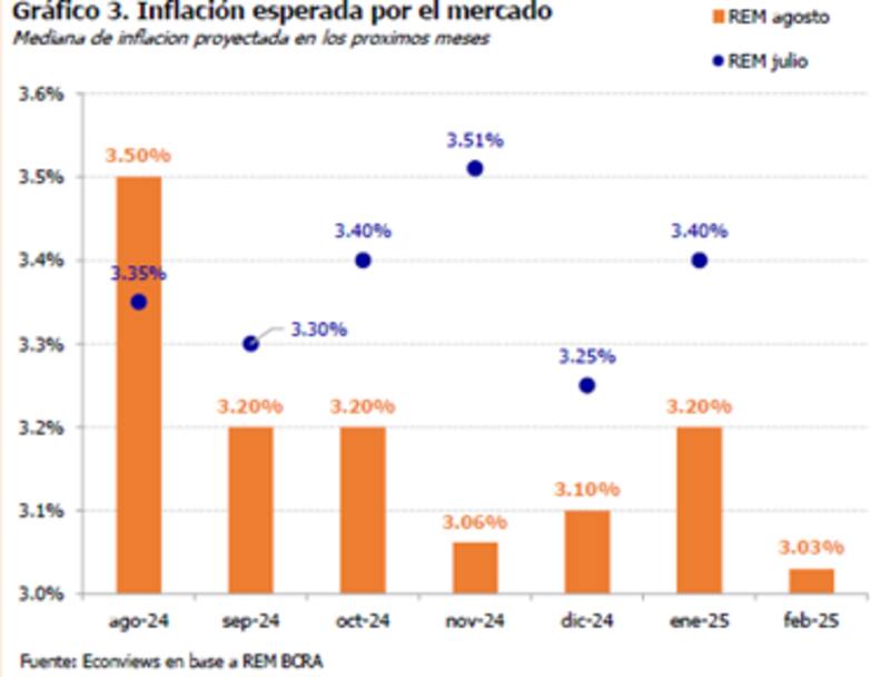 El mercado espera una inflación del 4% para agosto, aunque ve un piso por encima del crawling peg del 2%.