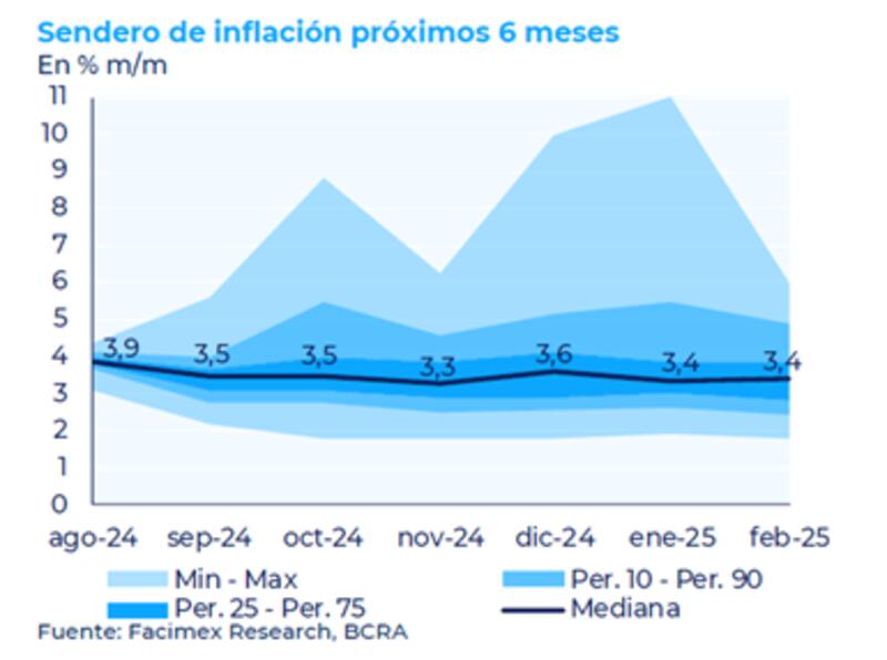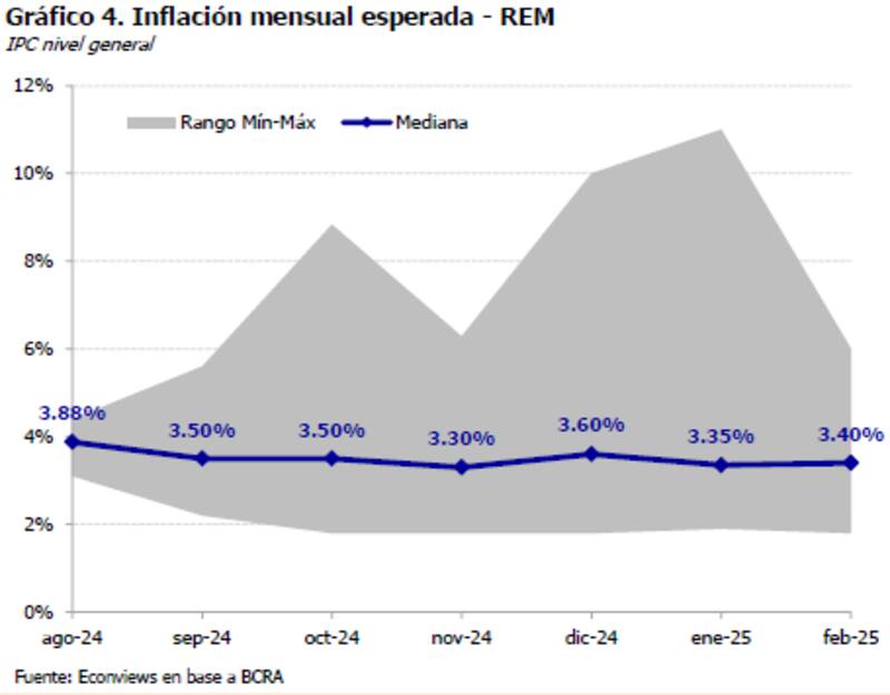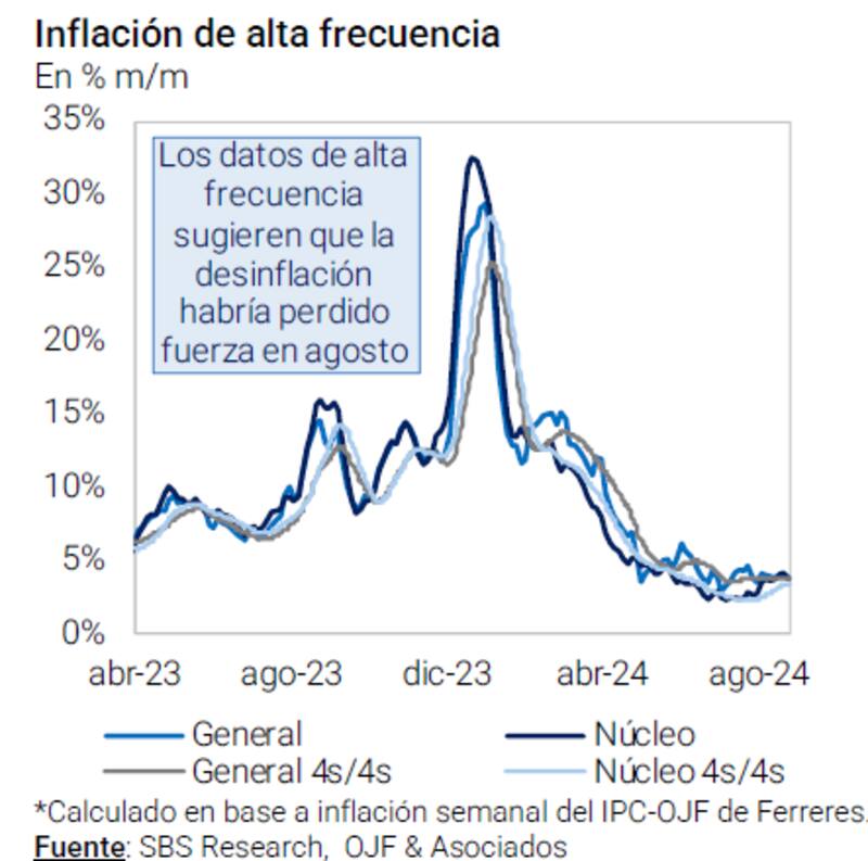 Por otro lado, las mediciones de inflación de alta frecuencia de agosto se ubican en un rango del 3,6% al 4,4% mensual, con una mediana del 4% mensual.
