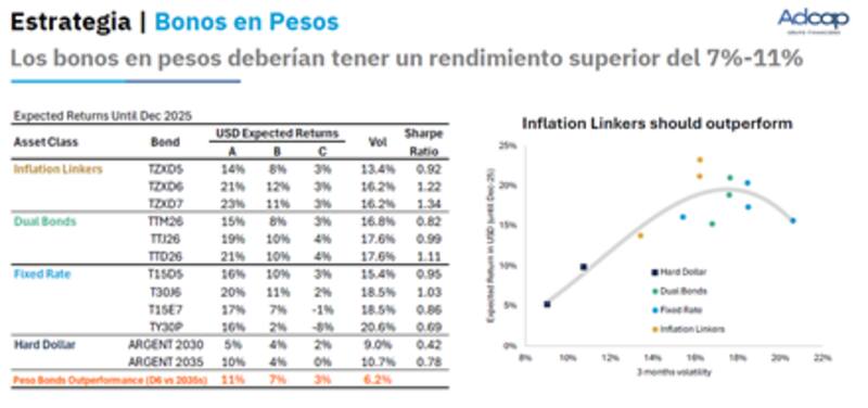Los analistas de Adcap le ven mayor potencial alcista a la deuda en dólares y agregaron que "si bien la mayor parte del potencial alcista proviene del mayor tipo de cambio real, los bonos ajustados por inflación deberían ser el activo menos volátil para aprovecharlo".