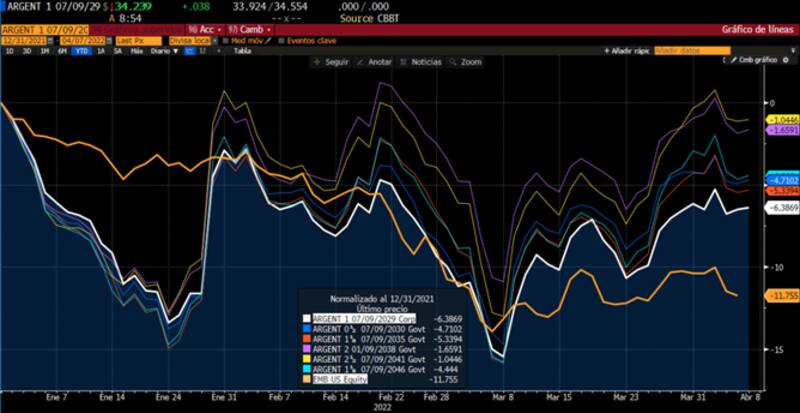 Todos los tramos de deuda soberana argentina dólares opera con pérdidas este año, con caídas de entre 6,44% y 1%. A su vez, el índice de emergentes cayó 11% en lo que va del 2022.