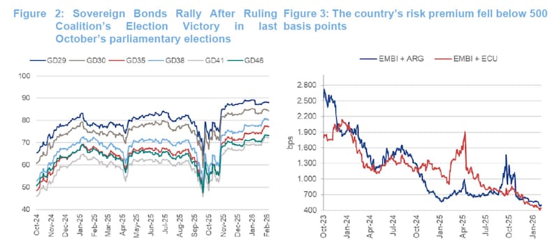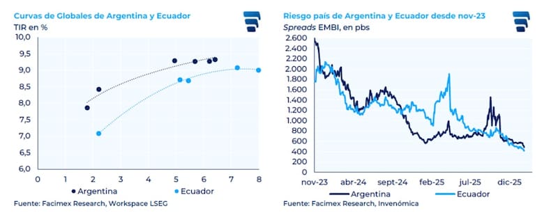 En ese sentido, entienden que la curva soberana argentina podría comprimir a niveles de 8,2% desde los 8,6% que opera hoy en el tramo medio si se replica el caso de Ecuador, mientras que el tramo más largo podría comprimir hacia 8,6% desde los 9% actuales.