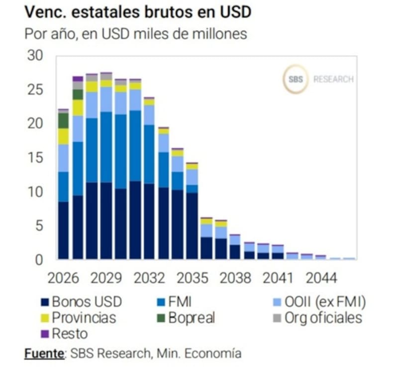 En 2026 restan más de u$s 10.000 millones para pagar deuda, mientras que tales compromisos saltan por encima de u$s 26.000 millones hasta 2032. Desde 2033 hasta 2035 vencen entre u$s 23.000 millones hasta u$s 15.000 millones por año.