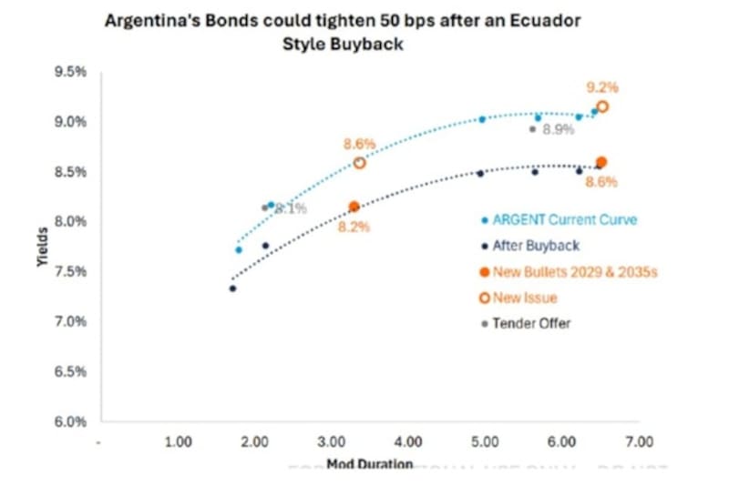“Luego de Ecuador, el candidato natural para recuperar el acceso al mercado es Argentina. Replicar una estrategia como la de Ecuador tendría beneficios sustanciales para Argentina. Ajustando por los bajísimos cupones de los bonos argentinos a 2029 y 2030, una operación como la de Ecuador aliviaría el perfil de vencimientos en más de u$s 13.000 millones hasta 2030”, estimó Yarde Buller.