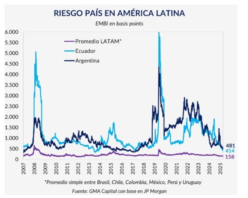En particular, Ecuador tiene un riesgo país de 485 puntos, mientras que el argentino es de 515 puntos.