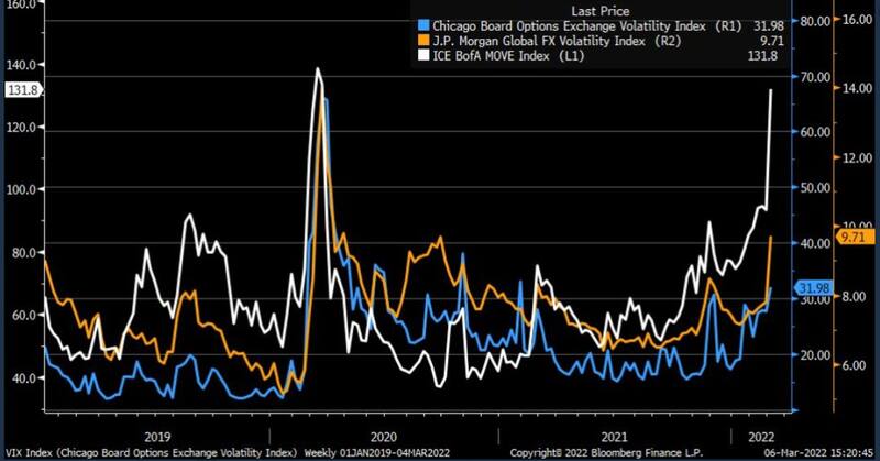 La volatilidad se disparó tanto en el mercado de bonos como de acciones y monedas. Puntualmente, en el caso de la volatilidad en el mercado de bonos, este toca su mayor valor desde el peor momento de la crisis del coronavirus.