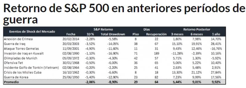La historia muestra que el inicio de una guerra suele significar una oportunidad de inversión. Salvo en el caso del conflicto en Afganistán, en el resto de los casos recientes de inicio de guerra,las acciones tienen una caída inicial para luego reanudar la tendencia alcista, lo cual implica que la baja actual, motivada por el estallido de la guerra entre Rusia y Ucrania, podría ser una oportunidad de compra.