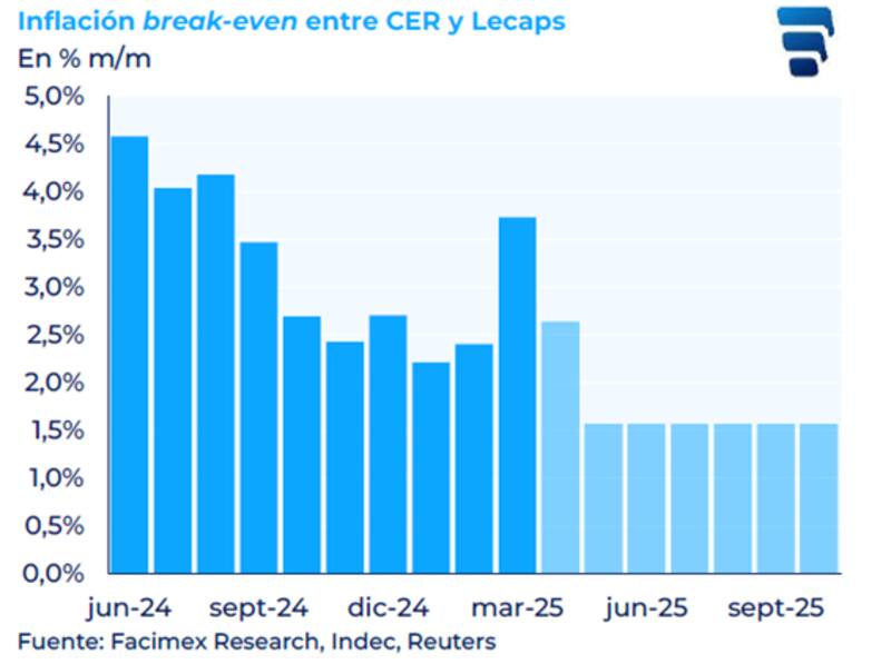 "Esperamos cierto reacomodamiento en las tasas de corto plazo. Para carteras de cash management priorizamos las Lecap de fines de mayo (S30Y5) y mediados de junio (S18J5) en 2,4% TEM o 33,5% TEA, complementadas con la Letam de julio (M31L5), cuya TAMAR break-even contra la Lecap de julio (S31L5) cerró ayer en 29,3%, 550pbs por debajo de la última TAMAR publicada por el BCRA (34,8%)", dijeron.