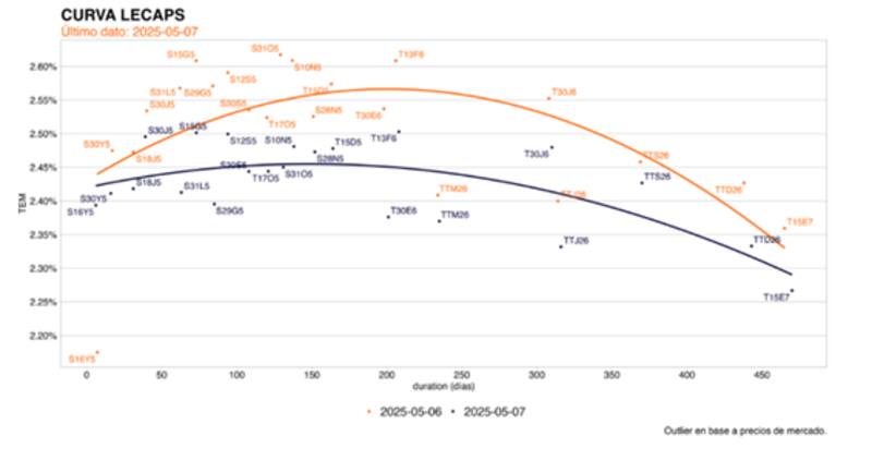 En las últimas jornadas, la curva de Lecap se desplazó a la baja y pasó de operar en niveles de 2,8% a valores actuales de 2,45% en el tramo corto y de 2,3% a 2,25% en el tramo más largo (TEM).
