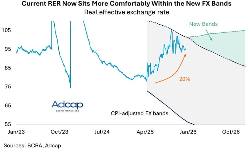 Federico Filippini, economista jefe de Adcap Grupo Financiero, explicó que las nuevas bandas son consistentes con el tipo de cambio real (TCR) actual, lo que le da mayor sostenibilidad al nuevo régimen de política monetaria.