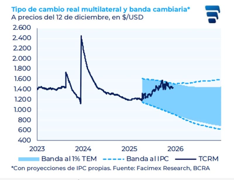 Sobre el futuro de las bandas, desde PPI puntualizaron que, en términos reales, bajo el nuevo ajuste por IPC T-2 y utilizando las expectativas del REM de noviembre, junto con la inflación promedio de los principales socios comerciales, el techo de la banda pasará (a pesos de diciembre de 2025) de un promedio mensual de $1.520 en diciembre a $1.554 en mayo de 2026, lo que implica un aumento real del 2,3%.