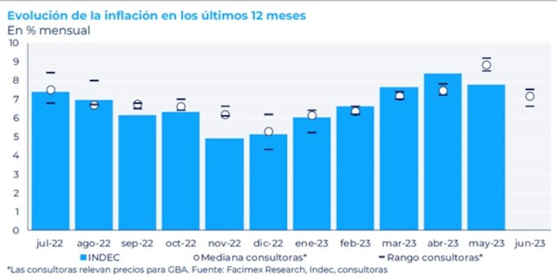 "Las mediciones privadas de inflación que seguimos mostraron registros en un rango del 6,6% al 7,5% mensual para junio. Además, todas las mediciones de consultoras que monitoreamos registraron una fuerte desaceleración en comparación con sus propios registros de abril y todas se ubicaron por debajo del 7,8% de mayo", explicó.