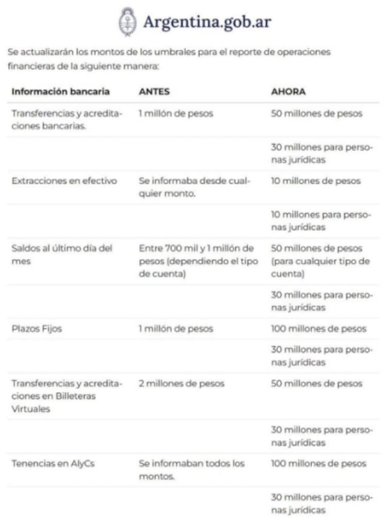 Además, se prohíbe a los bancos requerir declaraciones juradas de impuestos nacionales y se actualizan los umbrales para el reporte de movimientos financieros.