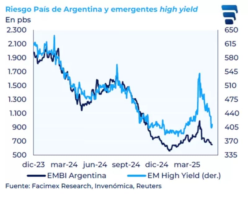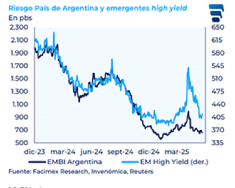 El riesgo país de Argentina se encuentra muy cerca de los mínimos alcanzados a comienzo de año, operando en 600 puntos básicos.