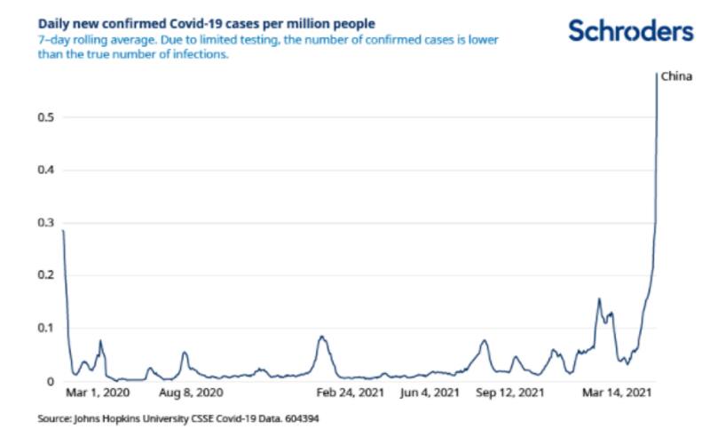 Además, el economista de Schroders agrega que los casos de Covid en China están aumentando considerablemente, hasta el punto de que ahora son los más altos desde la fase inicial de la pandemia a principios de 2020.