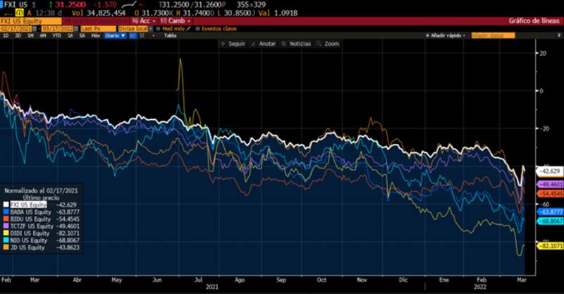 Por un lado, el conflicto bélico entre Rusia y Ucrania y el respectivo rally en el petróleo y gas provocó un empeoramiento en las perspectivas para las acciones chinas dado que al país asiático se le encareció el costo de la energía.