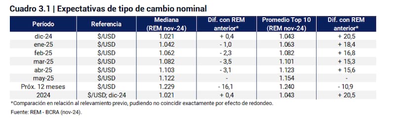 La mediana de las proyecciones de tipo de cambio nominal del REM se ubicó en $ 1021 por dólar para el promedio de diciembre de 2024, lo que implicaría una suba mensual promedio de 2,0% de la paridad cambiaria.