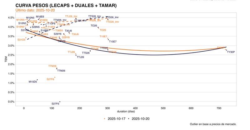 "La velocidad del movimiento será alta si el resultado del domingo es favorable para LLA seguramente, escenario en el cual veremos una caída del tipo de cambio y la posibilidad del Tesoro y BCRA de inyectar Pesos, bajando las tasas de todas las curvas de deuda en moneda local", indicó.
