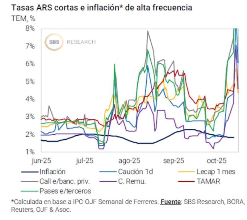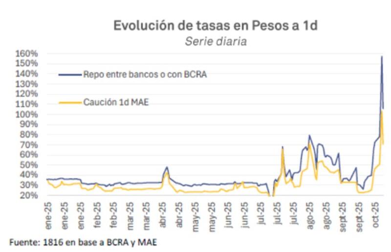 "La liquidez ha vuelto a escasear. El stock de pases del BCRA pasó de $5,62 billones el 29 de septiembre a -$ 386.200 millones el 14 de octubre. Esto provocó un fuerte aumento en las tasas de interés, con el TAMAR subiendo del 40% al 59% en el mismo período. Más aún, las tasas a un día se dispararon hasta un 125%", indicaron.