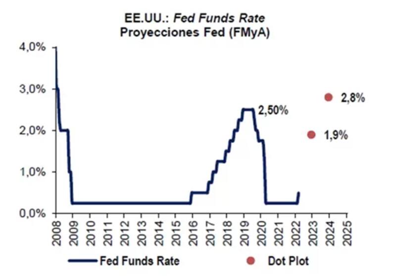 "Dados los niveles actuales de inflación interanual, no deberían sorprender algunos hikes consecutivos de esa magnitud, algo que podría llevar a la tasa de referencia a terminar más cerca del 2,5% que descuenta el mercado en lugar del 1,9% que anticipaba el ´Dot Plot´ de marzo", dijo Franco.