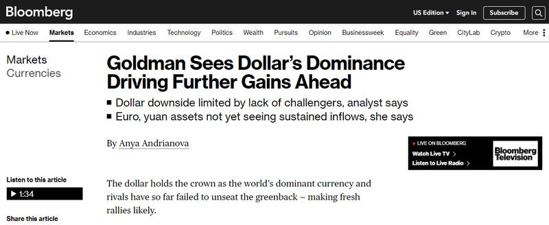 El texto titulado "Goldman Sees Dollar's Dominance Driving Further Gains Ahead" se hace eco de los pronósticos esbozados por la analista de Goldman Sachs Isabella Rosenberg para la divisa norteamericana.