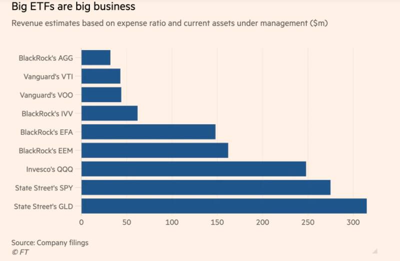 El ETF del mercado de valores, que es cómodamente el más grande del mundo con $ 289 mil millones de activos, cobra a los inversores finales una tarifa de solo 0.095% al año, lo que significa que sus ingresos brutos a State Street son actualmente de aproximadamente $ 275 millones anuales.