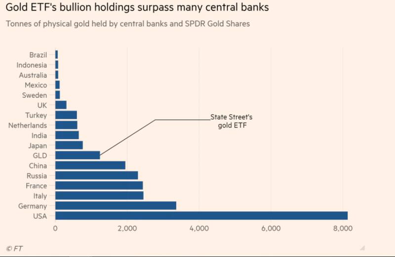 La recuperación del oro continuó el martes por la noche cuando el precio del metal superó los $ 2,000 por onza troy por primera vez. El tamaño del fondo, conocido por su ticker GLD, lo coloca entre las filas de los principales bancos centrales. Sus tenencias equivalen a una cuarta parte de todo el oro en Fort Knox en los EE. UU. Más que las reservas de oro del Banco de Japón, el Banco de Inglaterra o el Banco de la Reserva de la India, y no muy lejos de las 1.948 toneladas de China. metales preciosos, según datos del WGC .