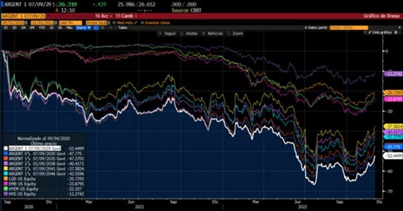 "El nuevo esquema de liquidación diferencial para sojeros ayudará a que ingresen alrededor de u$s 2000 millones en diciembre, lo cual fortalece la probabilidad de pago de los dos cupones en 2023 (u$s 2100 millones). Por otro lado, la deuda en pesos es un cuchillo de doble filo. Su debilidad benefició a los Globales por efecto sustitución, pero una crisis similar a la de junio y julio afectaría a todos los activos argentinos", dijeron.
