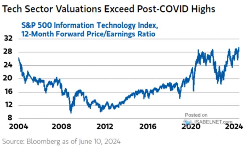 El ratio P/E forward a 12 meses opera en 28 veces ganancias en el sector tecnológico, prácticamente en su máximo desde al menos 2004.