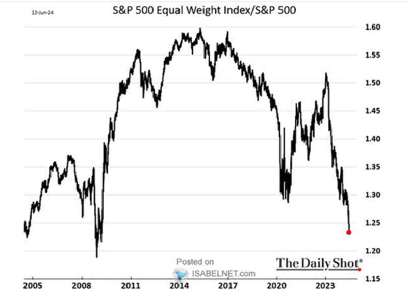 La relación entre el S&P500 equal weight y el S&P500 normal está en mínimos desde 2008.