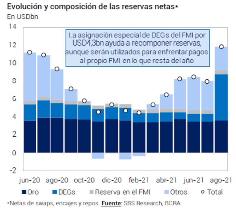 "La llegada de la asignación de emergencia en Derechos Especiales de Giro (DEG) del FMI por u$s 4300 millones es una pieza clave en este sentido, ya que estimamos una brecha de financiamiento externo en el orden de los u$s 3000 millones entre septiembre y noviembre traccionada por los vencimientos del FMI y la baja estacional de las exportaciones. El ingreso de los DEG fue crucial para cubrirla sin un impacto grande sobre las reservas netas", dijo.