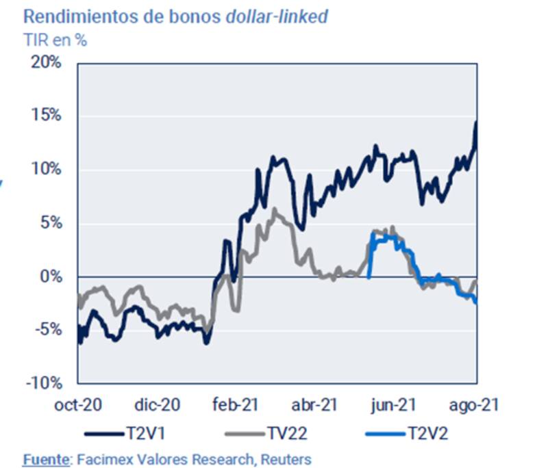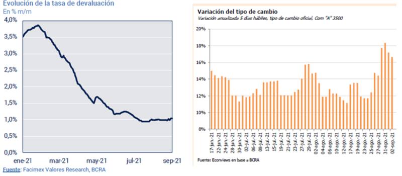 "Las tasas de Rofex negocian con tasas de devaluación implícitas para los próximos cinco y seis meses del 5% al 6%, mientras que hace un mes se encontraban cerca del 3,5%. Asimismo, también vimos que los bonos "dollar linked" negocian con tasas negativas ya que el T2V2 rinde devaluación -2,5%, cayendo desde niveles positivos de devaluación +1.0% de comienzos de agosto. Vemos también al BCRA muy activo en el mercado de cambios con la intención de sostener las expectativas de devaluación", dijo Gándara.