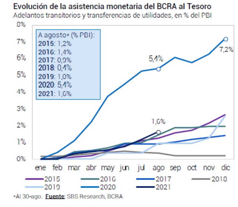 La asistencia monetaria creció el año pasado debido a que el Gobierno debió asistir a la economía con emisión monetaria producto de la pandemia y porque no podía financiarse en el mercado internacional ya que este se encuentra cerrado para la Argentina.