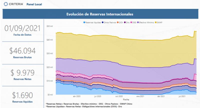 Actualmente, las reservas brutas suman u$s 46.094 millones, u$s 9979 millones de reservas netas y u$s 1690 millones de reservas liquidas.