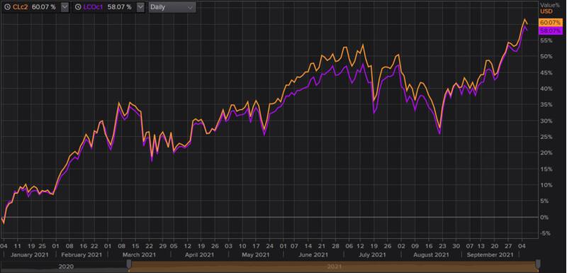 En lo que va del año, el petróleo WTI sube 60% y el Brent avanza un 58%.