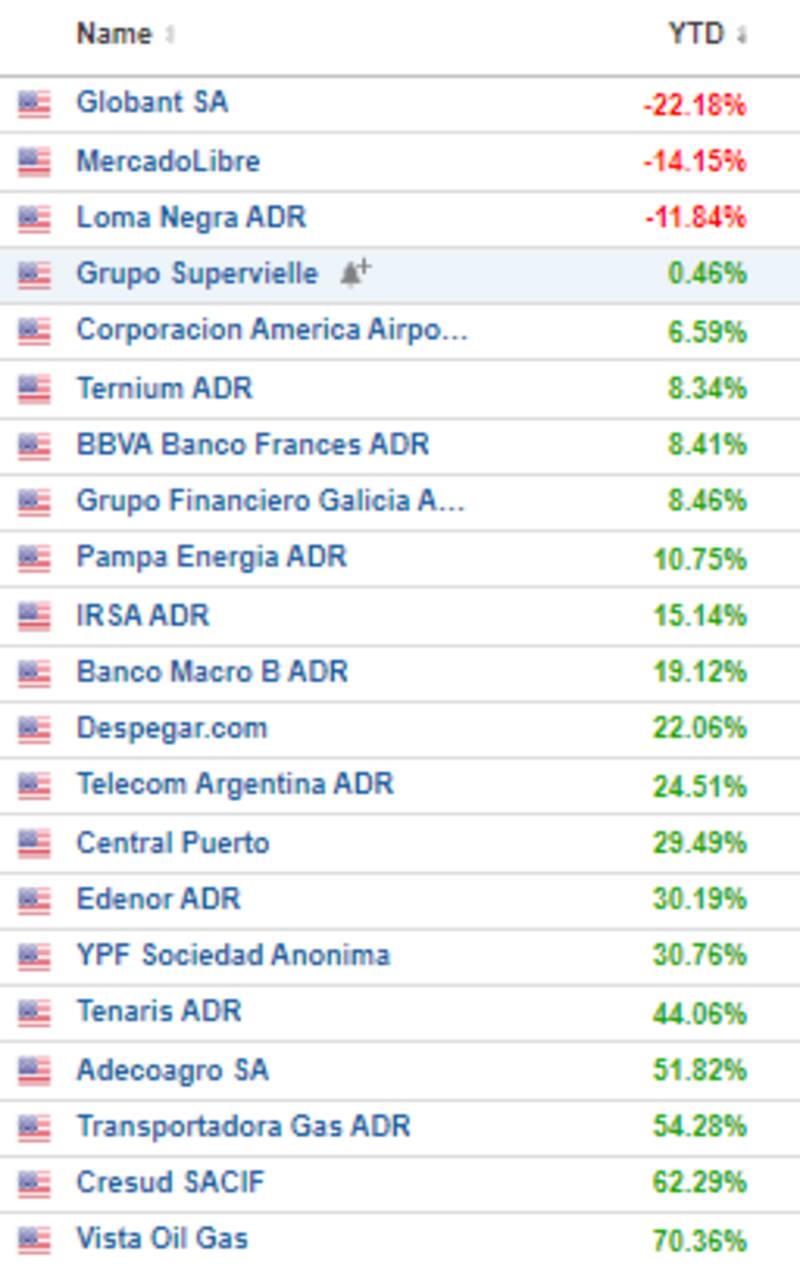 En lo que va del año, la gran mayoría de las acciones argentinas en Wall Street también operan con ganancias. Las subas son lideradas por la petrolera de Miguel Galuccio, Vista Oil, con avances de 70%. En el último año, de hecho, muestra rendimientos superlativos, con una ganancia acumulada de 233%.